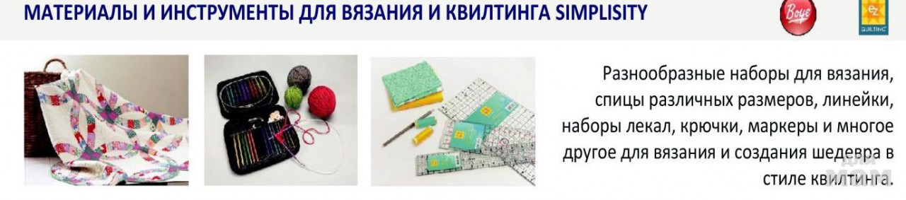 Вы так же найдёте инструменты для вязания и квилтинга (лоскутного шитья) брендов Boye и EZ Quilting.