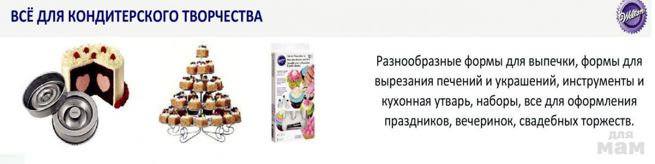 Особое место в ассортименте занимает продукция компании Wilton. В данном разделе представлен широкий ассортимент пищевой продукции и инструментов для декорирования кондитерских изделий, которые отличаются высоким качеством и современным дизайном.
