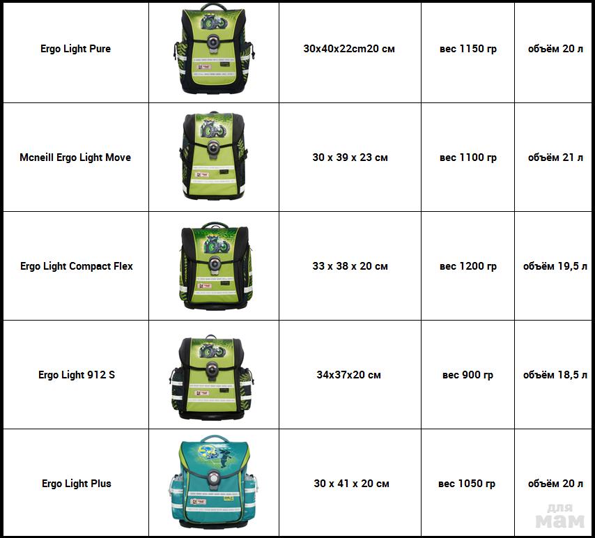 С 2017 года в линейке McNeill выпускаются 6 моделей ранцев. Ранцы отличаются внешним видом, системой лямок, боковыми карманами, размером и объемом. Все ранцы имеют удобный магнитный замок, дно из особо прочного пластика, ортопедическая спина, регулируемые ремни на мягких подушках.