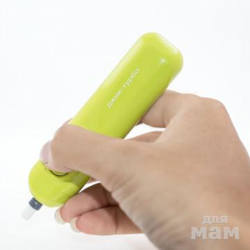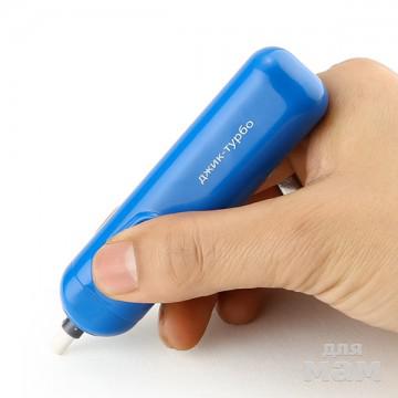 - Ластик работает от моторчика, который вращает сменный ластик.