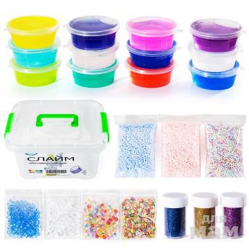 В наборе: 12 цветов слаймов (похожи по составу на лизунов), и 10 видов различных аксессуаров-наполнителей.
