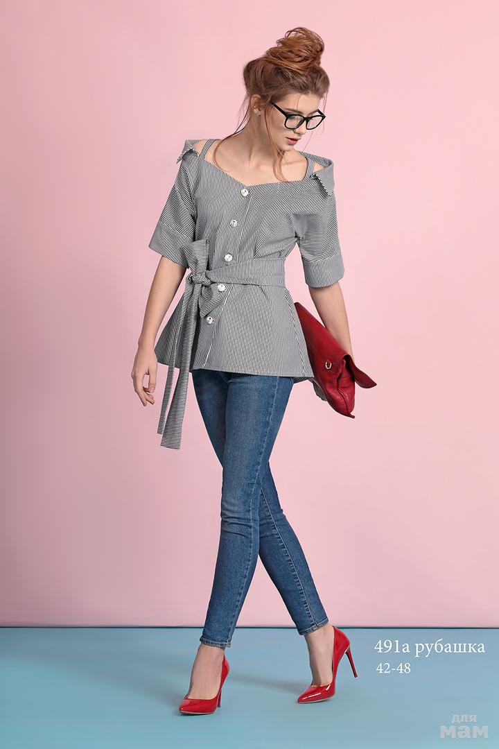 19. Рубашка прямого силуэта с открытой линией плеча, выполнена из стрейчевого джинса Рубашка с цельнокроеным рукавам и отложной манжетой. Воротник рубашечный на стойке. Рубаха на бретелях. Декор- широкий пояс. Состав: хлопок 100%