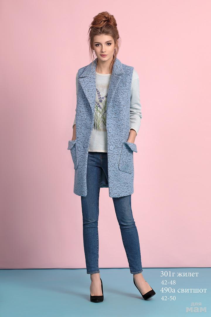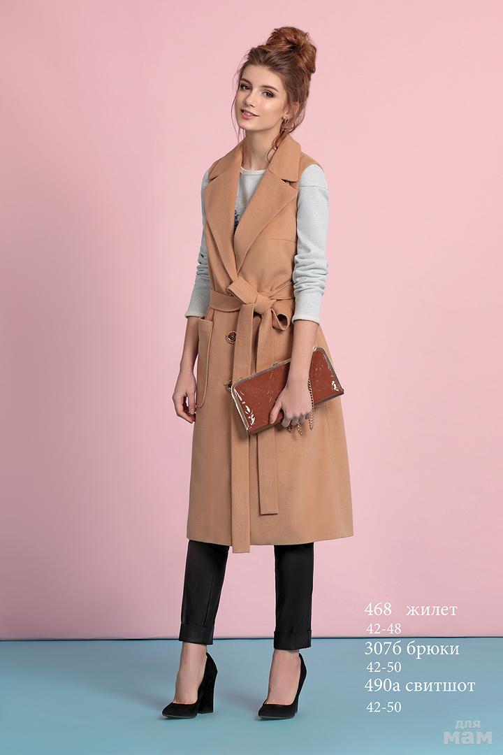 17. Жилет женский ,силуэта трапеция. Застежка центральная на 3 декоративные петли и пуговицы. Воротник пиджачного типа. На переде накладные карманы, вставленные в боковой шов. В комплекте пояс. Состав: ПЭ 65%, вискоза 30%, спандекс 5%