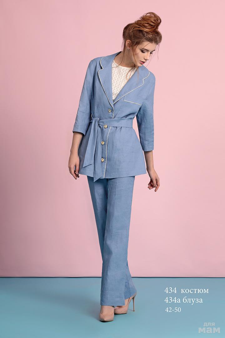 22. Женский льняной костюм, состоящий из узких классических брюк и жилета прямого силуэта. Жилет с цельнокроеным покроем рукава,центральной застежкой на три петли и пуговицы. Воротник- шаль. Декор- пояс-резинка и брошь. Состав: лен 100%