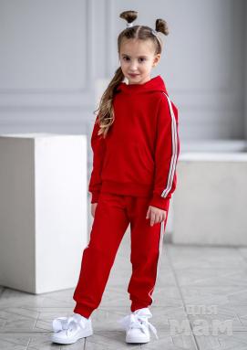 Костюм из трикотажа для девочек, младшей возрастной группы. Костюм состоит из худи и брюк, и выполнен из футера (2-нитки). Худи с двухслойным капюшоном, со спущенной линией плеча и заниженной проймой. Плечевые швы и рукава декорированы узкими отделочными лампасами. Капюшон по центру горловины переда обработан вставкой из рибаны в форме треугольника. Пояс по низу и манжеты на рукавах изделия обработаны эластичной рельефной рибаной. Брюки обработаны притачным поясом, внутри с резиной - для обеспечения удобной регулируемой посадки по обхвату талии. Боковые швы брюк оформлены узкими отделочными лампасами. Низ брюк фиксируется манжетой. Пояс и манжеты брюк обработаны эластичной рибаной.