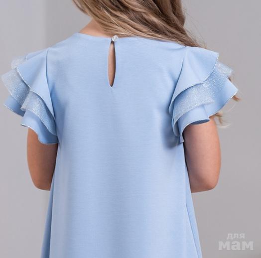 Платье из однотонного трикотажного полотна, силуэта трапеция, с многослойным рукавом-крылом. Горловина платья с изнанки обработана внутренними обтачками, на спинке расположена застежка-капля на пуговицу с воздушной петелькой. Рукав состоит из нескольких слоев материала: трикотаж, сетка мягкая, сетка серебро. Крой рукава с конической разводкой, которая формирует эффектный рукав с фалдами.
