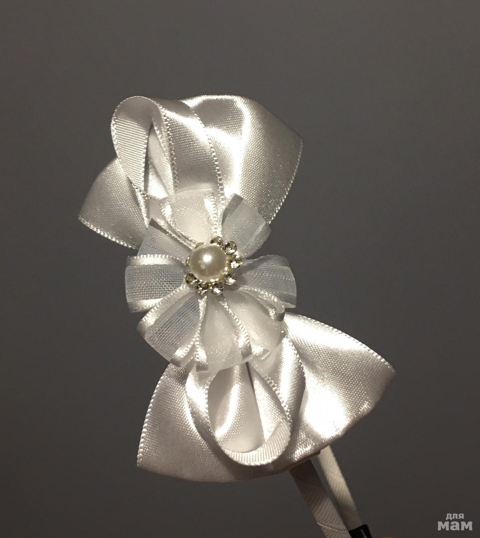Стильный и удобный ободок, декорированный бантом из атласной и капроновой ленты, серединка жемчужина со стразами.