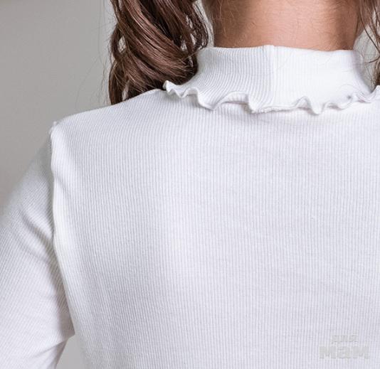 Модель блузки для младшей возрастной группы. Блузка из трикотажного полотна в комбинации с отделкой из сетки-мушки. Застёжка на спине на воздушную петлю-пуговицу, с разрезом формы-капля. Воротник плосколежащий из сетки-мушки с двухъярусной оборкой в сборку. Рукав двухслойный, верхний слой из секи-мушки со сборкой по окату и низу. Горловина и низ рукава зафиксированы окантовкой из основной ткани. Горловина оформлена кружевом ромашка, по центру пристёгивается брошь.