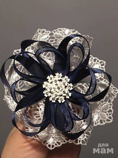 Очаровательный бант из атласной ленты с цветком из страз и жемчуга посередине. Длина 10 см.