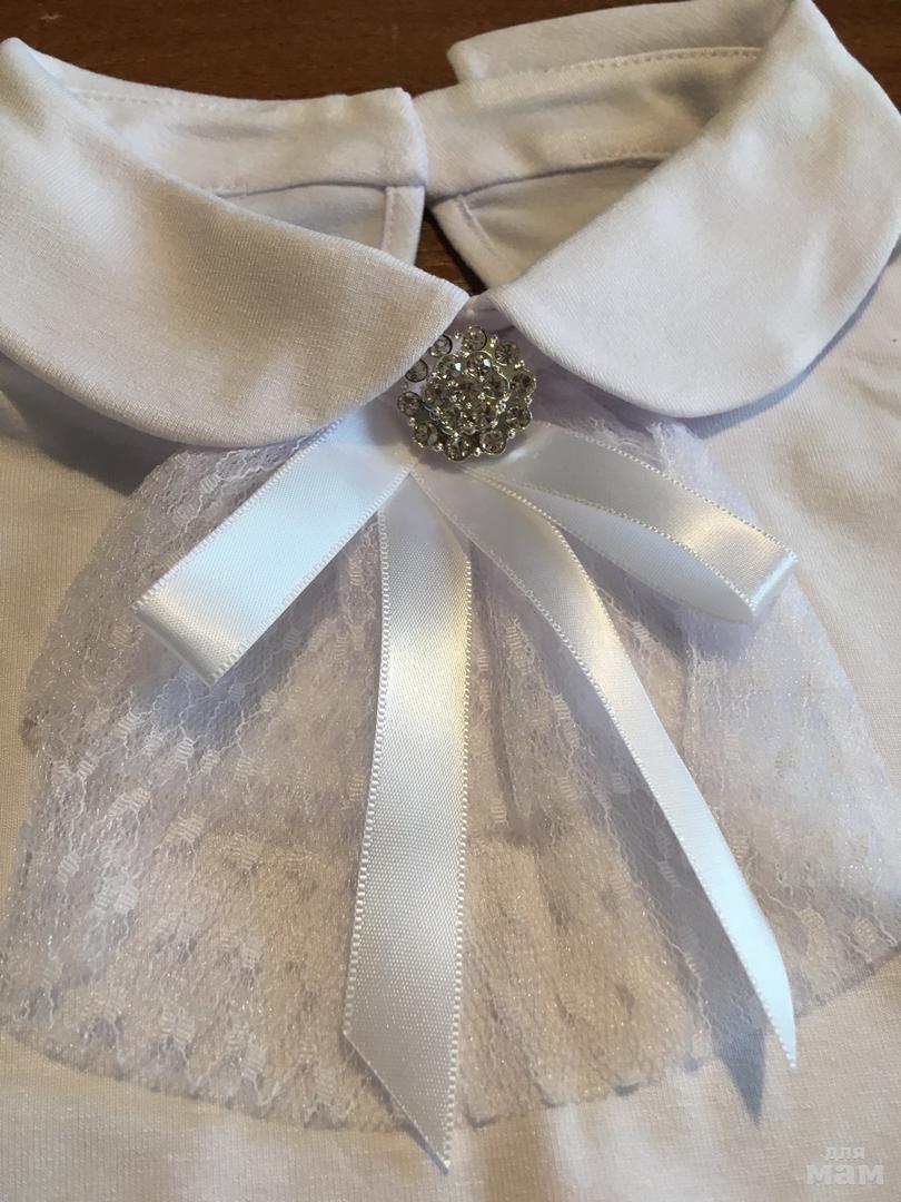 Трикотажная блузка выполнена из кулирной глади качества пенье(самое высокое).Рукав три четверти заканчивается очаровательным,маленьким, игривым бантиком. Горловина украшена красивым ажурным воротником белого цвета. Для удобства на спинке предусмотрена застёжка на пуговицу. Модель для девочек младшего и старшего школьного возраста.