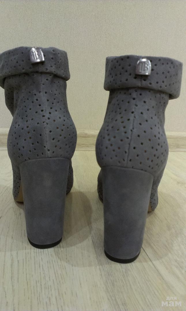 Серые ботильоны, мягкая замша, удобный каблук, обуваются за счет широкого голенища с присборенной передней частью.
