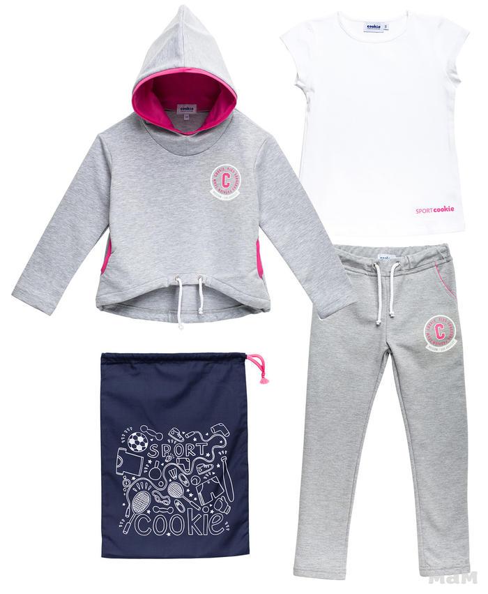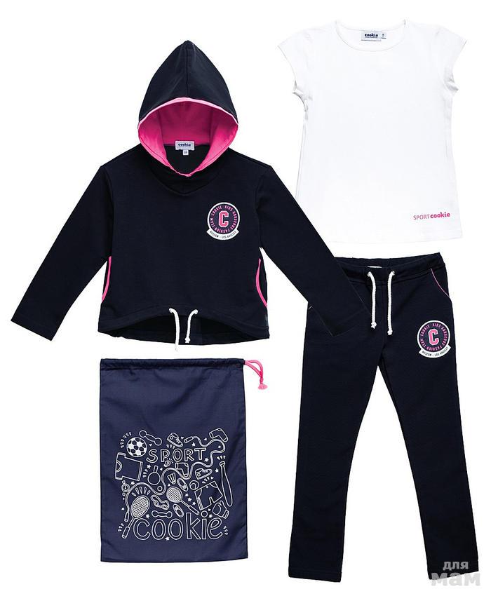 Комплект для занятий спортом или уроков физкультуры, состоит из трёх предметов: футболки, леггинсов и мешка для сменной обуви. Футболка белого цвета, прилегающего силуэта, с коротким рукавом, из хлопчатобумажного трикотажа. Леггинсы тёмно-синего цвета длиной 3/4. Мешок для сменной обуви имеет размеры: 29х37 см.