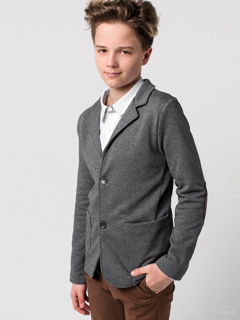 Пиджак для мальчиков из трикотажного полотна серого цвета. Пиджак классического покроя, застёгивается на две пуговицы, дополнен накладными карманами.