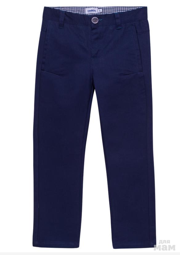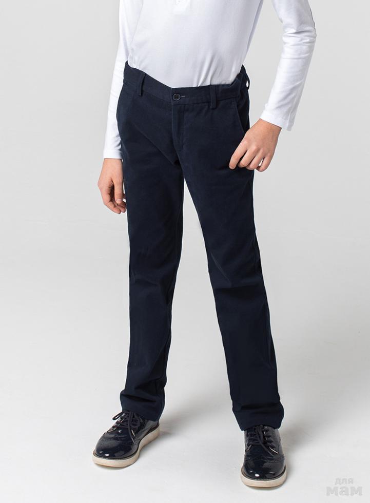 Школьные брюки чиносы для мальчика синего цвета. Ткань хлопок с эластаном - комфорт в носке, не вытягиваются колени. Застежка спереди на молнию. Два кармана спереди и один прорезной сзади. Регулировка по талии на резинке и пуговицах