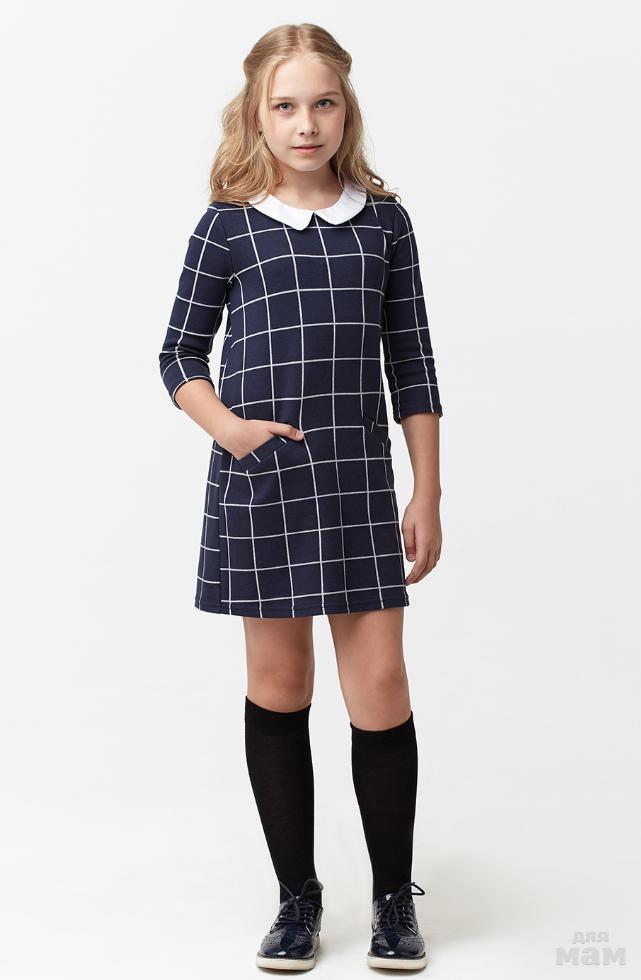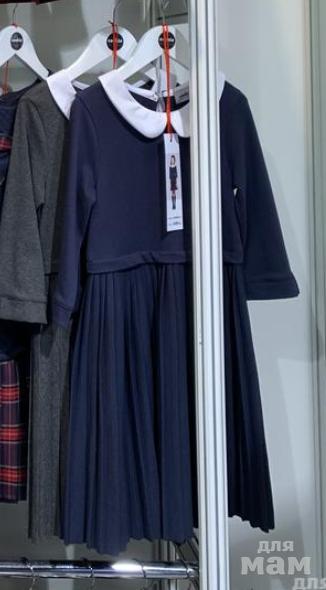 Платье из трикотажного полотна синего цвета с белым отложным воротничком. Платье отрезное выше линии талии, юбка плиссированая с открытым срезом по низу (срез не осыпается). Рукав 3/4 с небольшой манжетой. Платье очень мягкое и приятное у телу.
