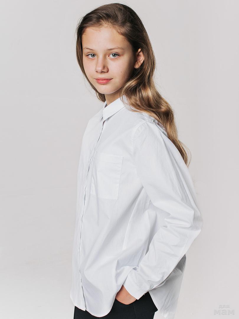 Блузка из хлопка белого цвета, свободного силуэта с ассимитричным нижним срезом. Модель застёгивается на пуговицы, воротник отложной со стойкой, рукава длинные. Блузка дополнена нагрудным карманом и украшена вышивкой.
