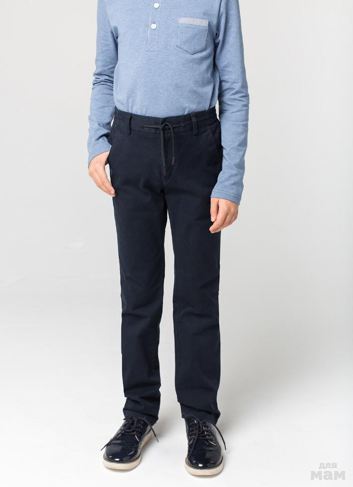 Школьные брюки чиносы для мальчика на резинке синего цвета. Ткань хлопок с эластаном - комфорт в носке, не вытягиваются колени. Застежка спереди на молнию. Два кармана спереди и один прорезной сзади. По талии встрочена резинка и дополнена шнурком для лучшей регулировки
