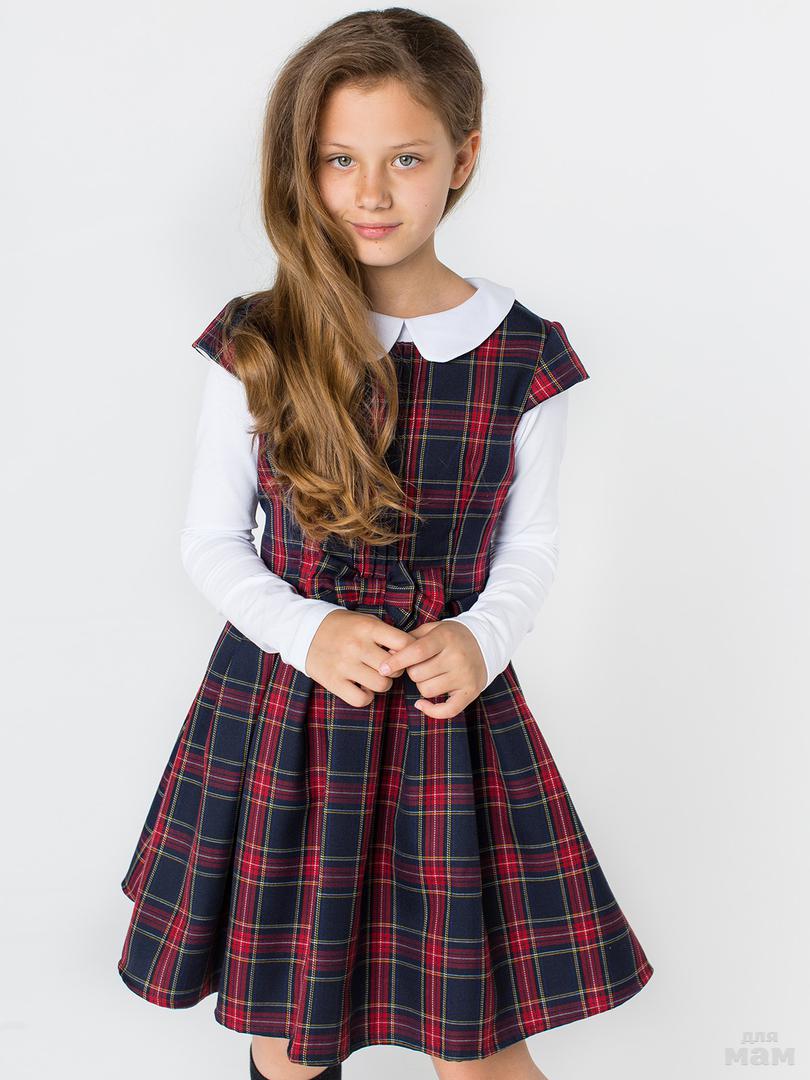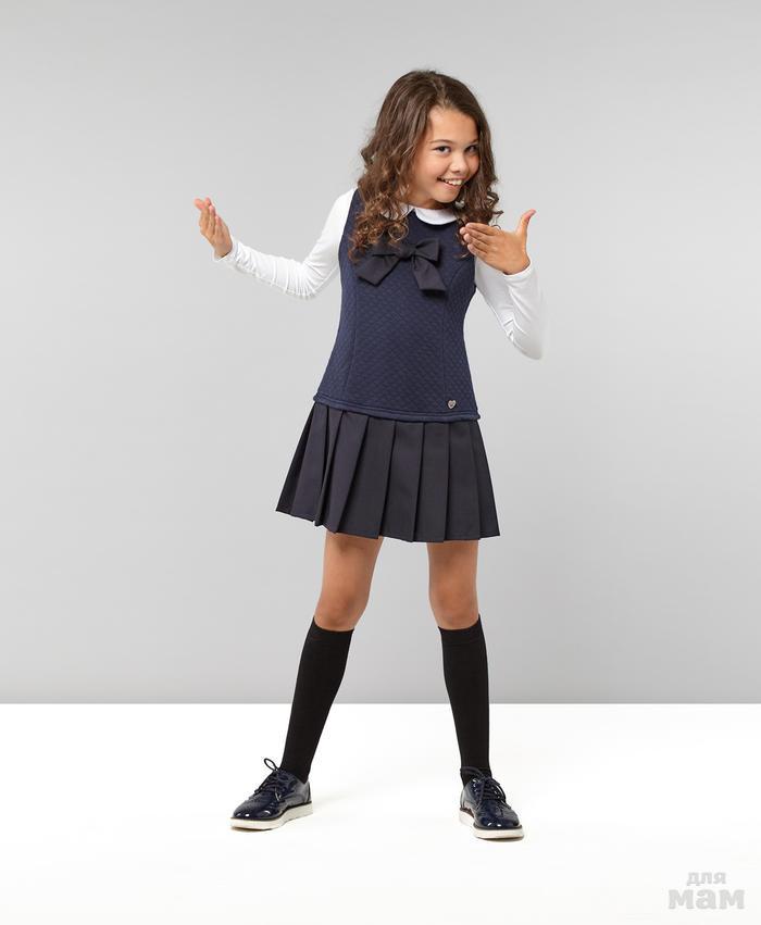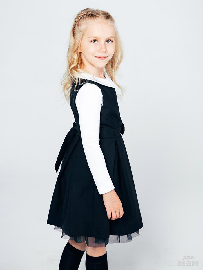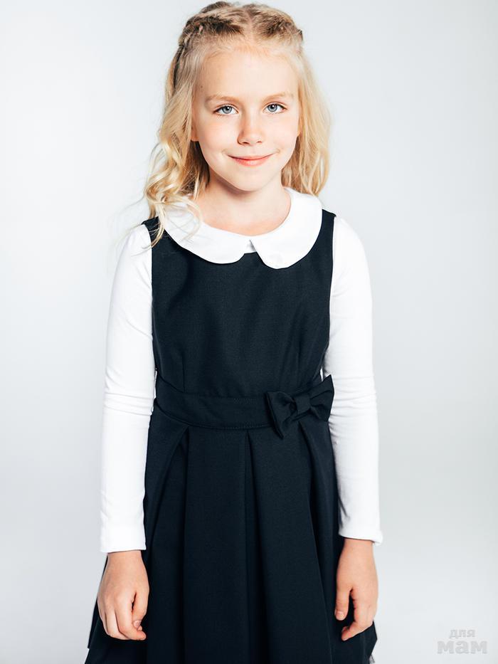 Сарафан из высококачественного полушерстяного материала синего цвета на подкладке из хлопка белого цвета. Сарафан полуприлегающего силуэта, для фиксирования на талии, дополнен полупоясом, украшенным бантом-бабочкой. Застёгивается сарафан при помощи застёжки - молнии. По низу юбки подкладочная ткань дополнена оборкой из фатина. Сарафан предназначен для повседневной носки и в качестве школьной формы.