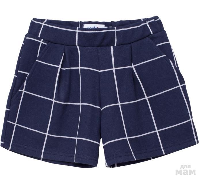 Шорты из трикотажной синей ткани в клетку с боковыми карманами. Пояс регулируется при помощи перфорированной резинки. Шорты подарят комфорт и необычный образ.