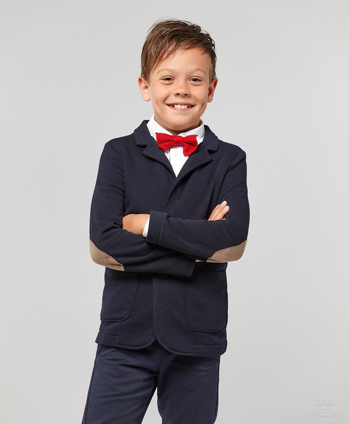 Пиджак для мальчика из трикотажного полотна зауженного кроя. Стильный и удобный вариант для повседневной носки, комфортная альтернатива классическому пиджаку. Подойдет в качестве элемента школьной формы. Однобортный отложной воротник. Застёгивается на две пуговицы, дополнен накладными карманами