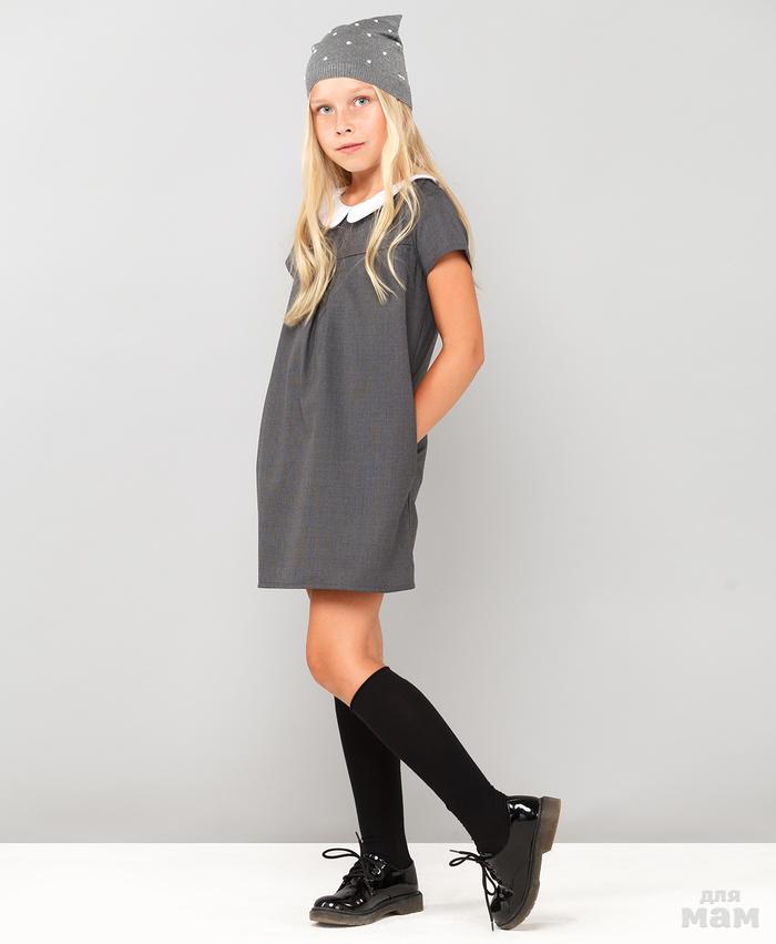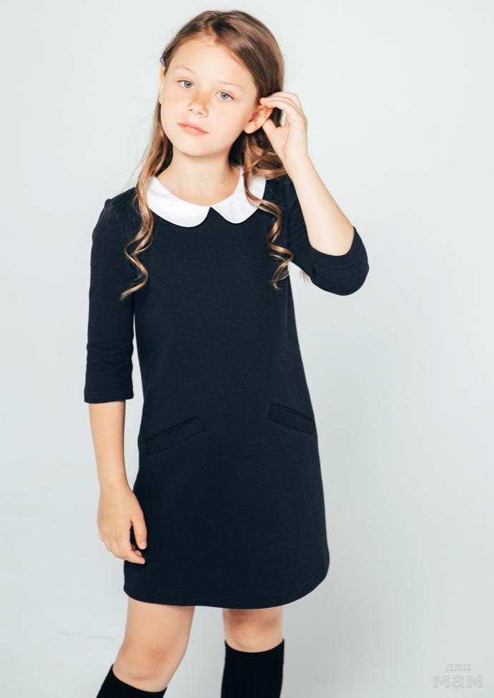 Платье свободного кроя, изготовлено из полушерсти темно-синего цвета. Модель с белым отложным воротничком и карманами в боковых швах. Дополнительный комфорт обеспечивает подкладка из 100% хлопка. Замечательно смотрится не только само по себе, но и с водолазкой или футболкой с длинным рукавом. Не стесняет движений, поэтому отлично подойдет для школы или садика.
