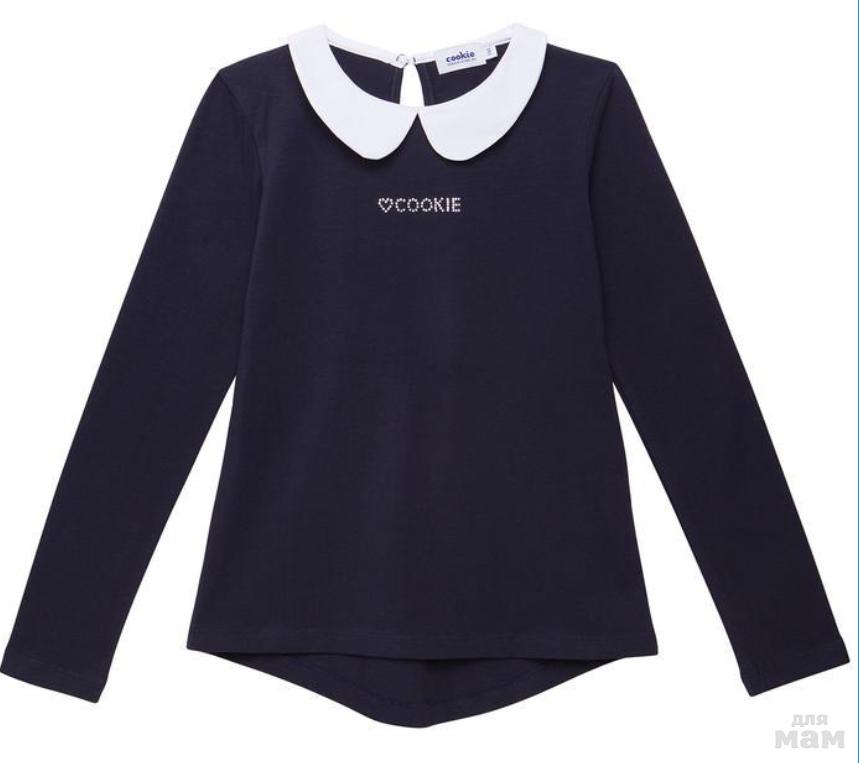 Очень комфортный и практичный джемпер-обманка из трикотажного материала синего цвета. Застегивается при помощи пуговиц на горловине спинки. Украшен металлической пуговичкой "Cookie".