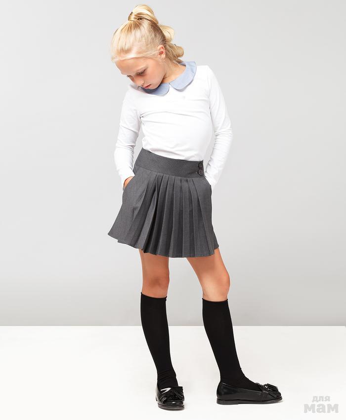 Юбка-парео серого цвета со складками спереди. Имеет застежки на две пуговицы снаружи и одну потайную. Дополнительный комфорт обеспечивает подкладочная ткань из 100% хлопка. Незаменимая вещь для школьных будней. Она будет расти вместе с ребенком, при необходимости стоит только переставить пуговицы.