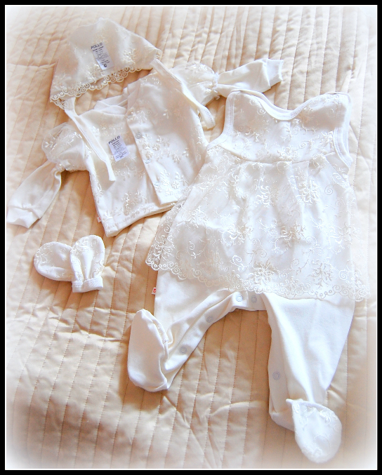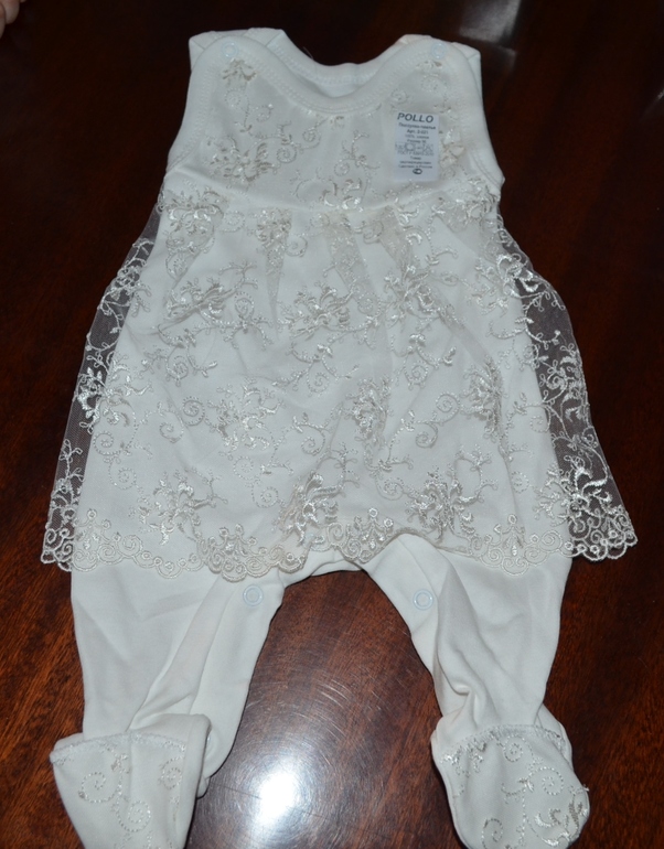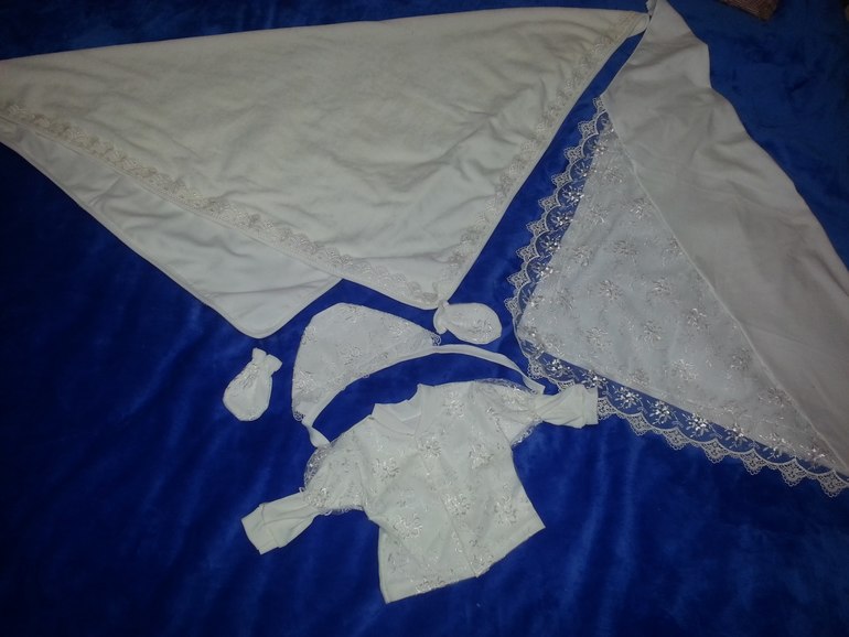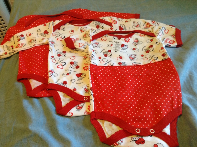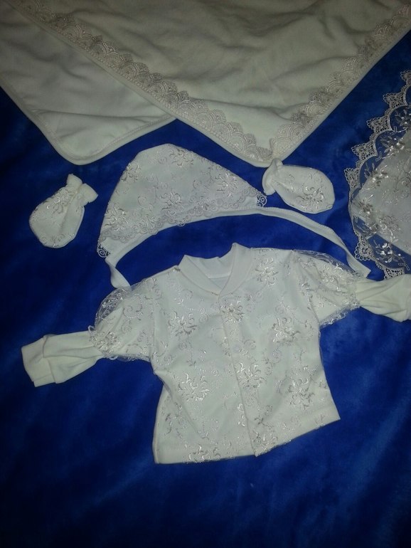 комбинезон для новорожденных (арт.2-112), к нему чепчик (арт.2-156), цвет экрю; боди с коротким рукавом голубого цвета (арт.2-135 ), все 56 размера. А также плед-одеялко для малышей молочного цвета (арт.4-011) и два набора пеленок: трикотажные (арт.2-081) и из футера (2-082). К качеству никаких нареканий. Мягкая, приятная на ощупь ткань, ровные аккуратные строчки. У комбинезона швы наружу и закрытые ручки. Длина комбинезона от между ножек до горловины - 32см, у боди - 29см. Примерить пока не на кого, ждем.