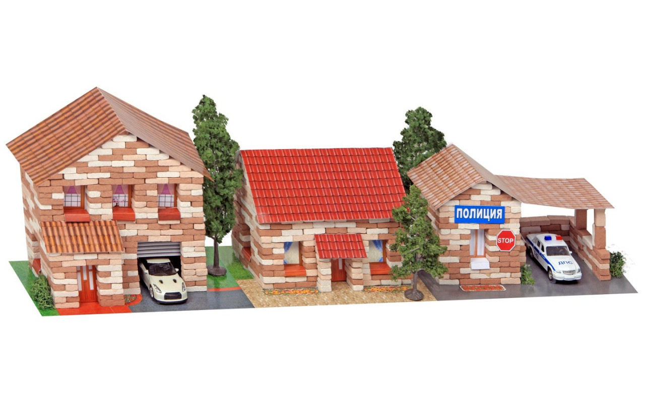 Основным строительным материалом в наборе является кирпич (размером ~10x20x4мм), который изготовлен из полимерного материала (вспененный пенополистирол). С виду, он очень похож на каменный кирпичик, но очень легкий по весу, что позволяет при сборке получить облегченное строение. В набор также входят: инструкция по сборке, площадки под строение и блок с декоративными элементами. Соединение элементов производится с помощью клея ПВА, который входит в набор. Построение можно производить по схеме и чертежу определенной модели, а так же воплотив свои любые архитектурные решения.