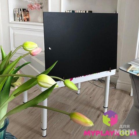 К столикам Myplayroom можно приобрести дополнительное игровое поле. На выбор представлены 6 дизайнов (Городок, Карта Мира, Зоопарк, Домик, Лего-Космос, Лего-Город). Обратная сторона поверхность покрыта меловой краской для рисования мелом.