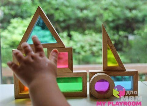 Вместе с ребенком комбинируйте деревянные радужные блоки. Цвета накладываются один на другой и дают новые оттенки. Ребенок расставляет кубики на столе, а на стене вырисовывается разноцветный орнамент. Квадраты и прямоугольники, круги и полукруги, различные треугольники – это универсальные формы, из которых малыш соберет любую картинку, предмет или целый город.