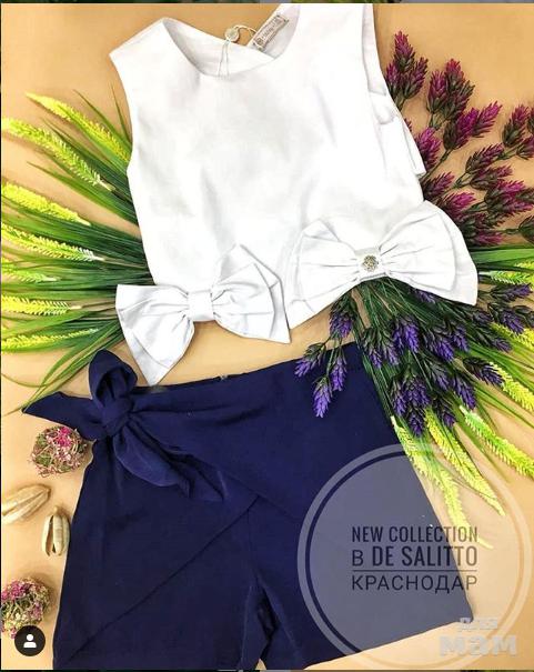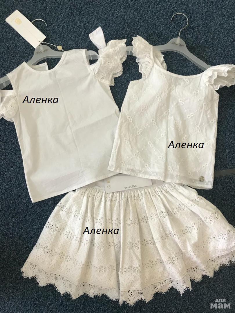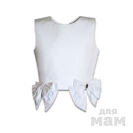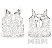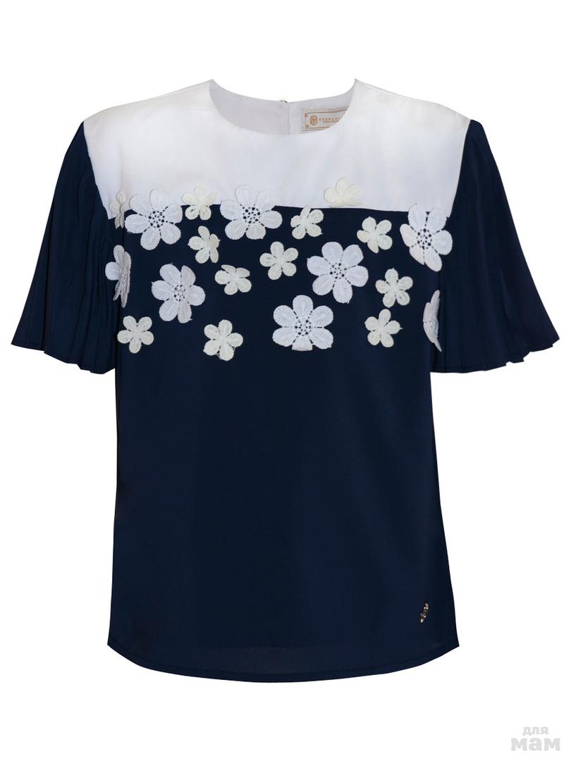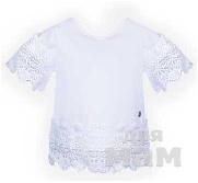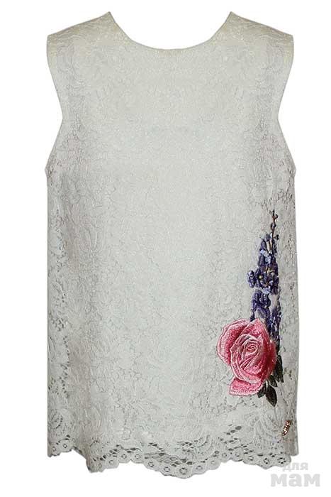 Блузка для девочек, модель выполнена из ажурного полотна, внутри тонкий хлопковый подклад, спереди на полочке вышитый цветок аппликация, внизу пришивное лого, сзади застежка на фирменные пуговицы с планкой по среднему шву спинки, а также к планке пришиты два банта из тонкой черной рапсовой ленты.