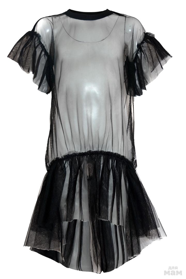 Птатье-туника модель асимметричная, выполнена из тонкой трикотажной сетки, силуэт oversize спущенная линия плечевого пояса, рукав - волан, по линии плечевого шва - настрочная репсовая лента полочка и спинка оформлена фигурной линией с притачным широким воланом на линией притачивания волана - пришивное лого горловина оформлена притачной рибаной в цвет изделия на полочке вдоль линии плеча - принт флок