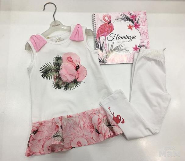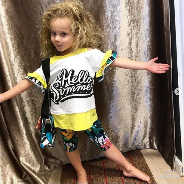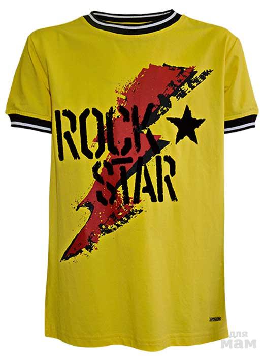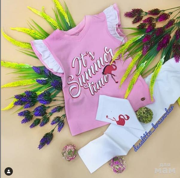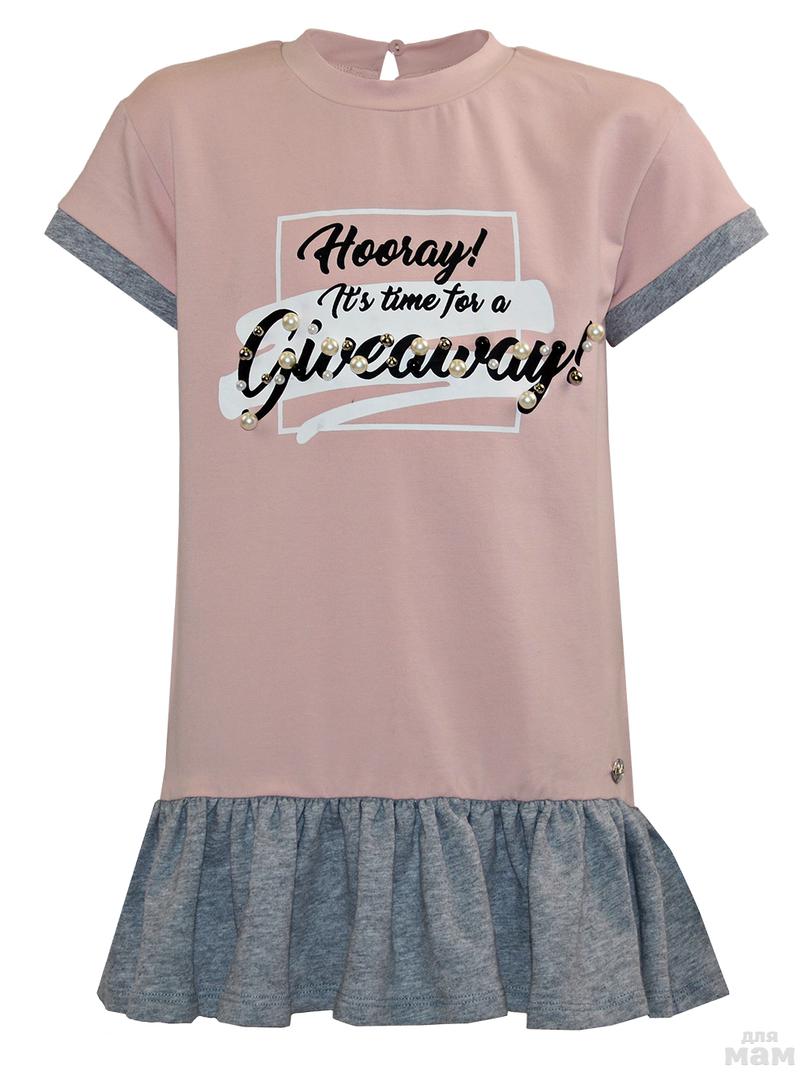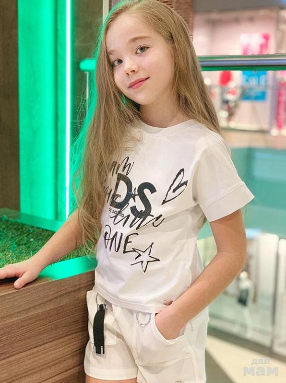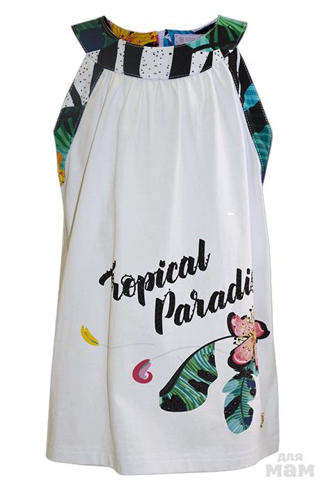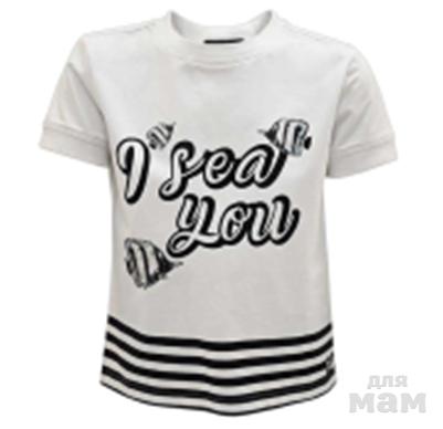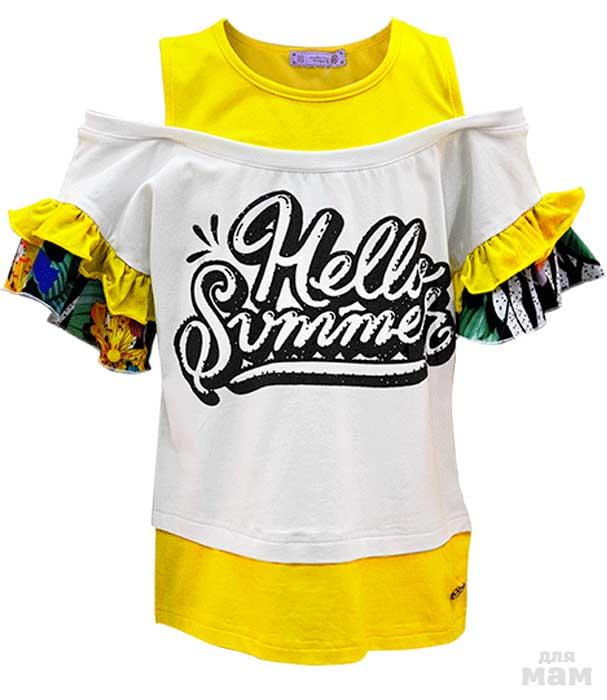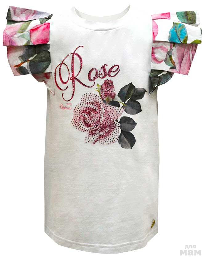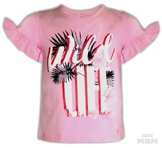 Футболка трикотажная для девочек, на полочке принт украшен стразами, на плечах притачные воланы из принтованной ткани, горловина из притачной трикотажной рибаны, внизу полочки нашивка лого.
