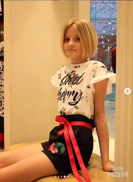 Блузка-топ для девочек, модель укороченная, выполнена из принтованного хлопка, со спущенным рукавом, супатная застежка с планкой на пуговицах, низ на резинке с небольшой сборкой, отложной воротник на стойке, вдоль горловины лучевые декоративные вытачки, по низу - пришивное лого.