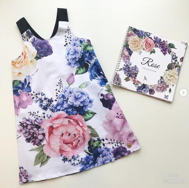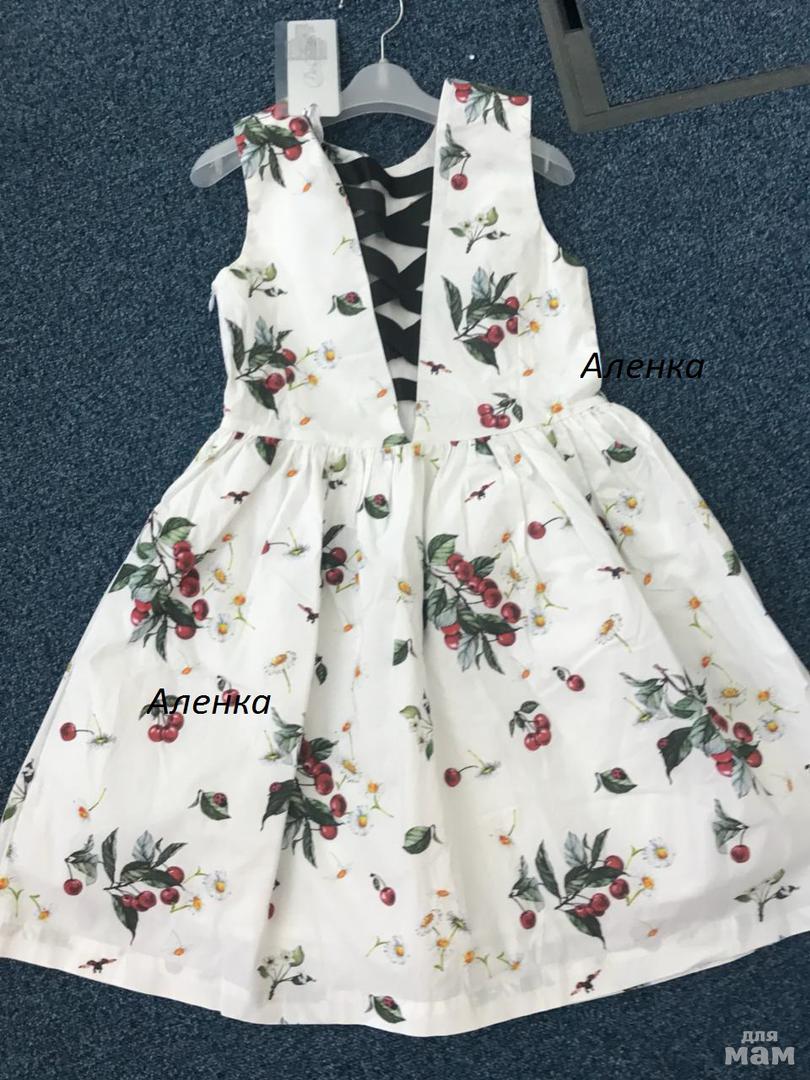 Платье из принтованного хлопка, отрезное по линии талии. В боковых швах воздушные петли, в них вставлен съемный пояс, который завязывается в бант на спинке. Юбка - полусолнце. На спинке потайная молния. Подкладка х/б розового цвета. Горловина - отложной вороничок.