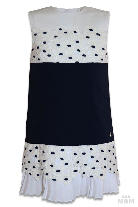 Платье-туника, модель комбинированная, выполнена из трикотажа и гипюра, прямого силуэта, спущенная линия плеча, горловина окантована бейкой из основной ткани, на полочке - аппликация из PU с вышивкой DeSallitto, на юбке и рукавах - притачные полосы из гипюра, внизу - пришивное лого.
