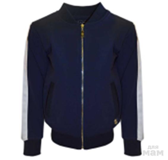 Куртка-бомбер, модель выполнена из плащевой ткани, на молнии, на тонком слое синтепона на рукавах и спинке притачнаяе контрастная вставки с принтом, горловина, манжеты и низ изделия - притачная рибана контрастного цвета, на полочке в рельефах, обработаны карманы с контрастными рамками, на пулере молнии декоративная принтованная тесьма,под карманом - пришивное лого.