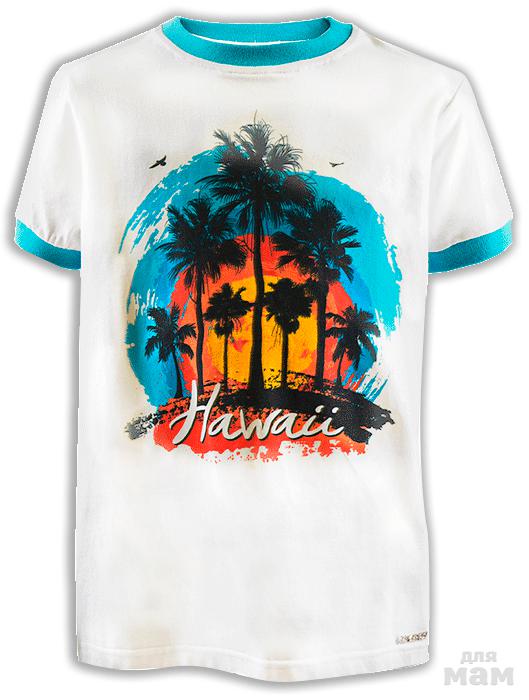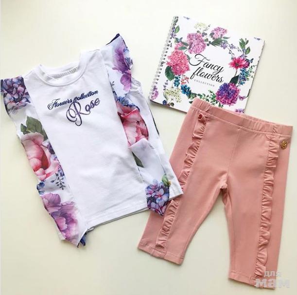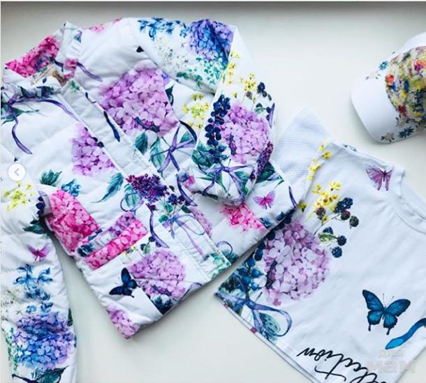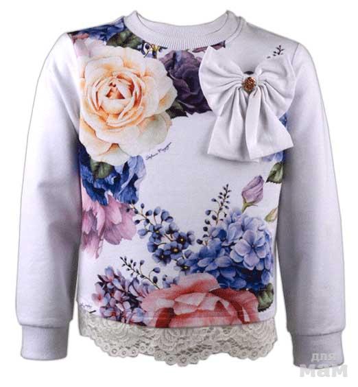 Футболка трикотажная, комбинированая, полочка и спинка выполнены из футболочного трикотажа, притачные рукава - из принтованного хлопка. На полочке цветочный принт декорирован стразами.