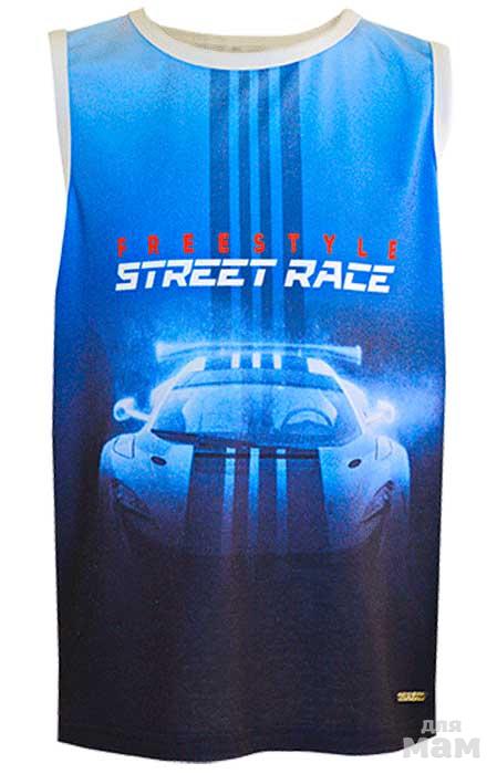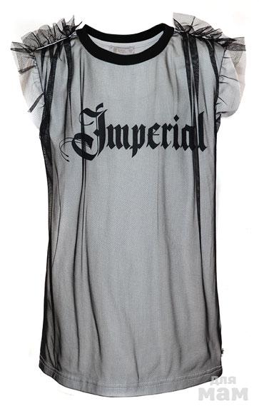 Футболка трикотажная для девочек, верхний слой полочки - тонкая сетка контрастного цвета, по горловине притачная контрастная рибана, вдоль линии плеча и проймам рукавов расположена рюша из сетки, на полочке принт - надпись, внизу нашивка лого.