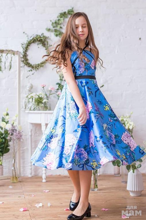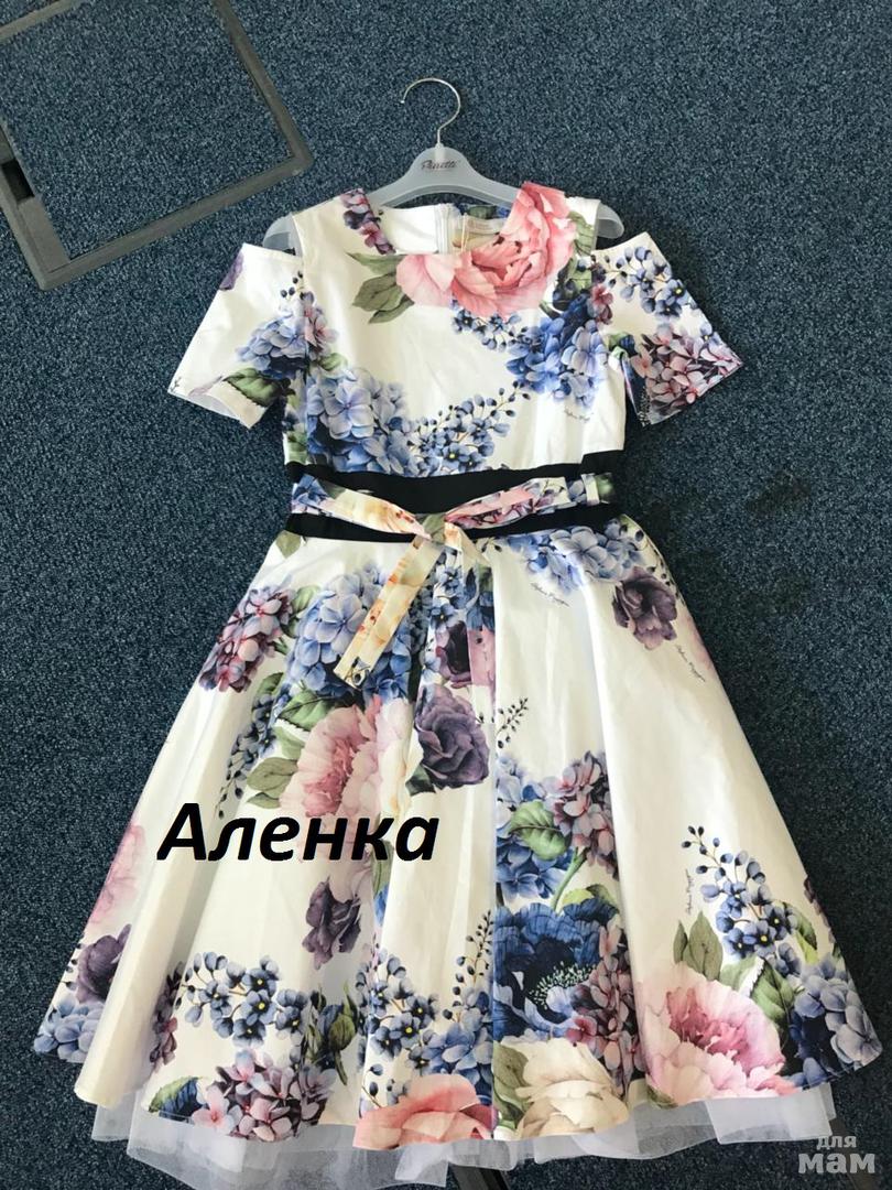 Платье с открытыми плечами, модель выполнена из принтованого хлопка-сатина, притачной контрастный пояс, сверху на шлевках пояс из основной ткани завязывается на бант, на спинке потайная молния, подъюбник из сетки, х/б подклад.