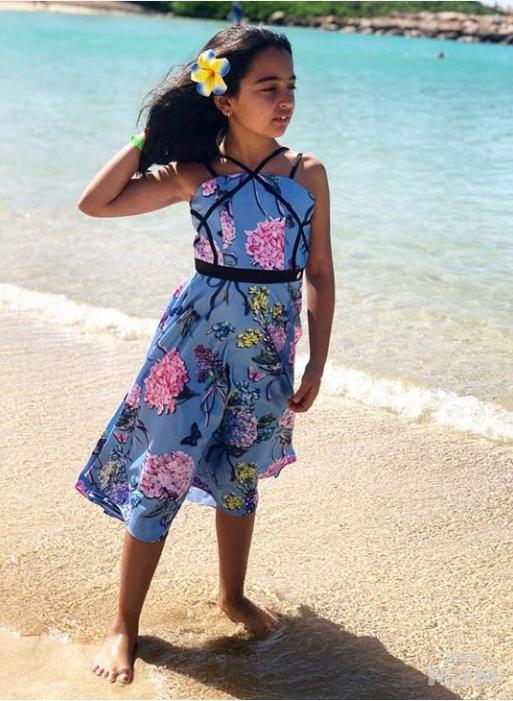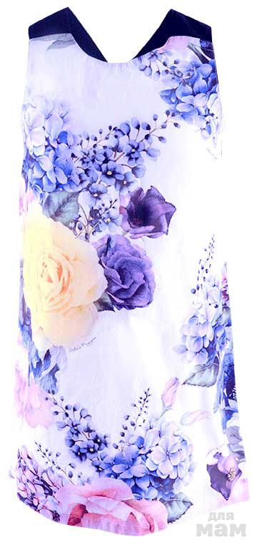 Сарафан на тонких контрастных бретелях (регулируются по длине), модель выполнена из принтованного хлопка-сатина с эластаном, на тонком х/б подкладе в цвет основного изделия, отрезное по талии, контрастный притачной пояс, силуэт юбки - солнце, полочка декорирована контрастными бейками, на спинке в среднем шве потайная молния, на поясе - пришивное лого.