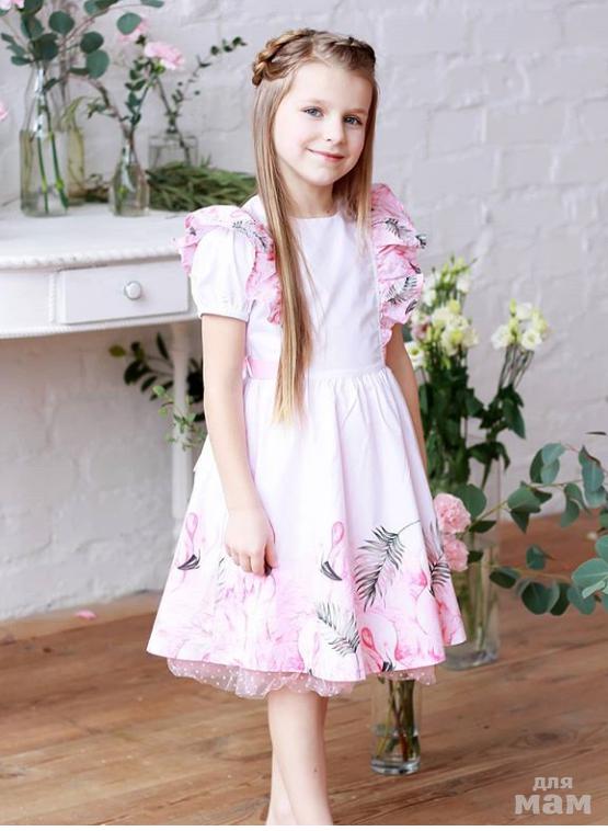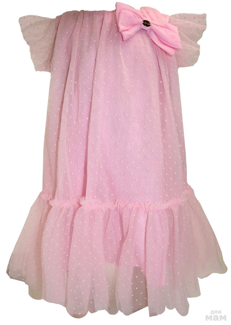 Платье нарядное для девочек, выполнено из сетки в два слоя, отрезной волан по низу юбки. Рукава в виде рюши из сетки. Нам полочке съемный бант с лого. На спинке потайная молния. Подкладка-хлопок розового цвета.