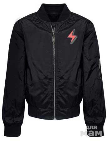 Черная куртка из полиэстера. На передней части молния.Карманы прорезные с клапаном, клапан фиксируется на кнопку.Горловина, манжеты и низ изделия - рибана. Карман нашивной на рукаве на молнии. Капюшон отстегивающийся на пуговицах (трикотаж). На рукаве принт. На груди настрочная нашивка.