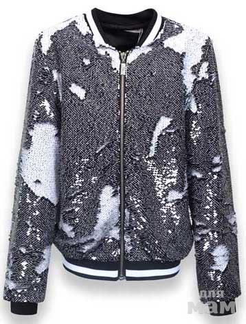 Куртка-бомбер для девочек, модель выполнена из полотна с двухсторонними пайетками (черный-белый), спереди застежка на молнию, подклад тонкий атлас, низ изделия, манжеты и горловина - притачная трикотажная рибана с контрастными черно-белыми полосками, рукав длинный, втачной со слегка опущенной линией плеча, карманы в боковых швах, слева на поясе пришивное лого.