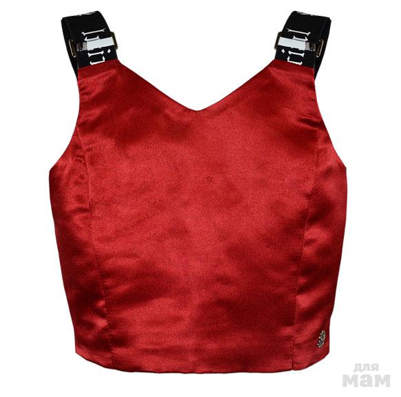 Топ атласный, укороченный до линии талии, на тонком хлопковом подкладе, на полочке и спинке рельефные вытачки, на спинке - металич. молния с брендированным пулером, горловина полочки оформлена фигурным вырезом, топ на широких бретелях (резинка) с метеллическими пряжками и контрастным принтом- надписью, внизу на полочке нашивка лого.