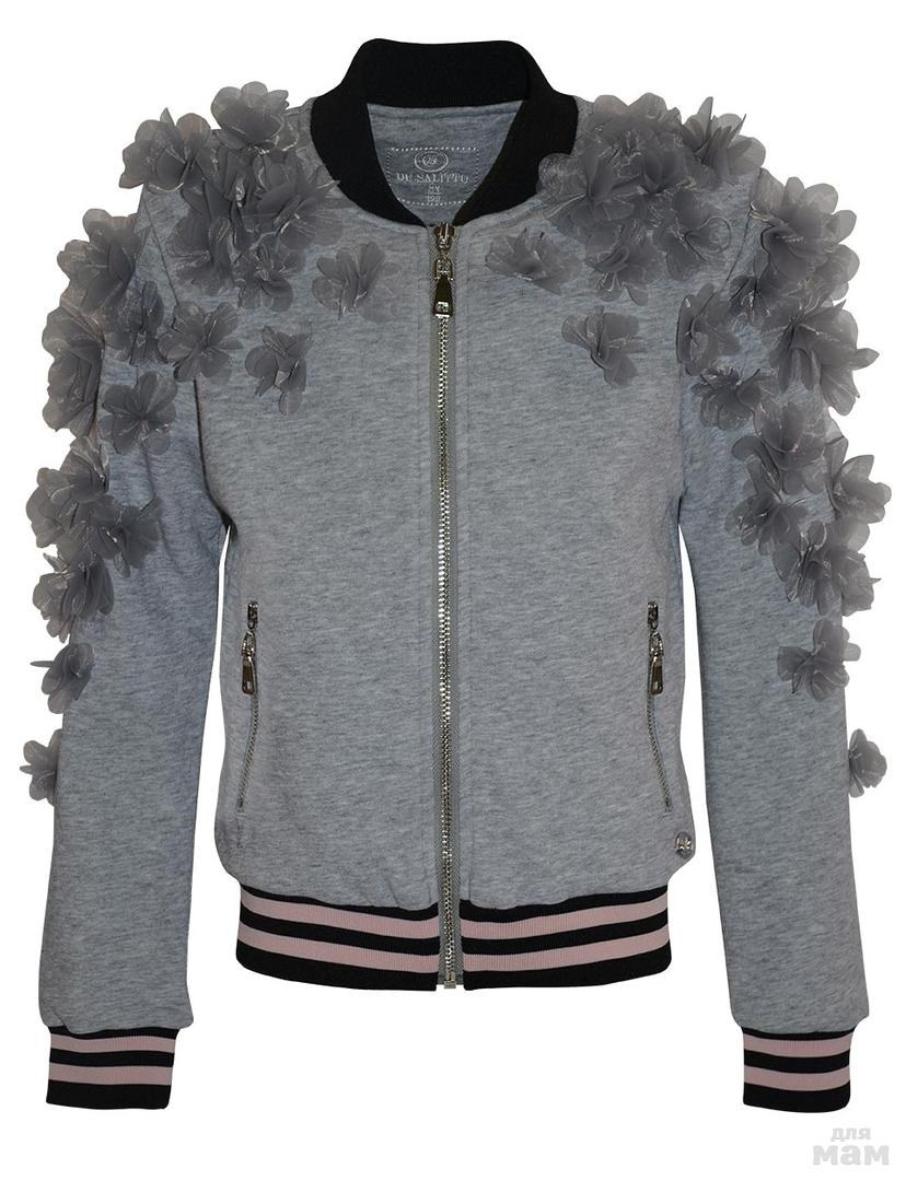 Свитшот - модель выполнена из трикотажа, спущенная линия плеча, рукав 3/4,горловина обработана внутренним кантом из основной ткани, на полочке - принт, DS - инкрустированы етализированными стразами вдоль линии плеча, рукава и над манжетой - настрочная декоративная тесьма серебристого цвета, по низу - пришивное лого,фурнитура - металл (серебро).