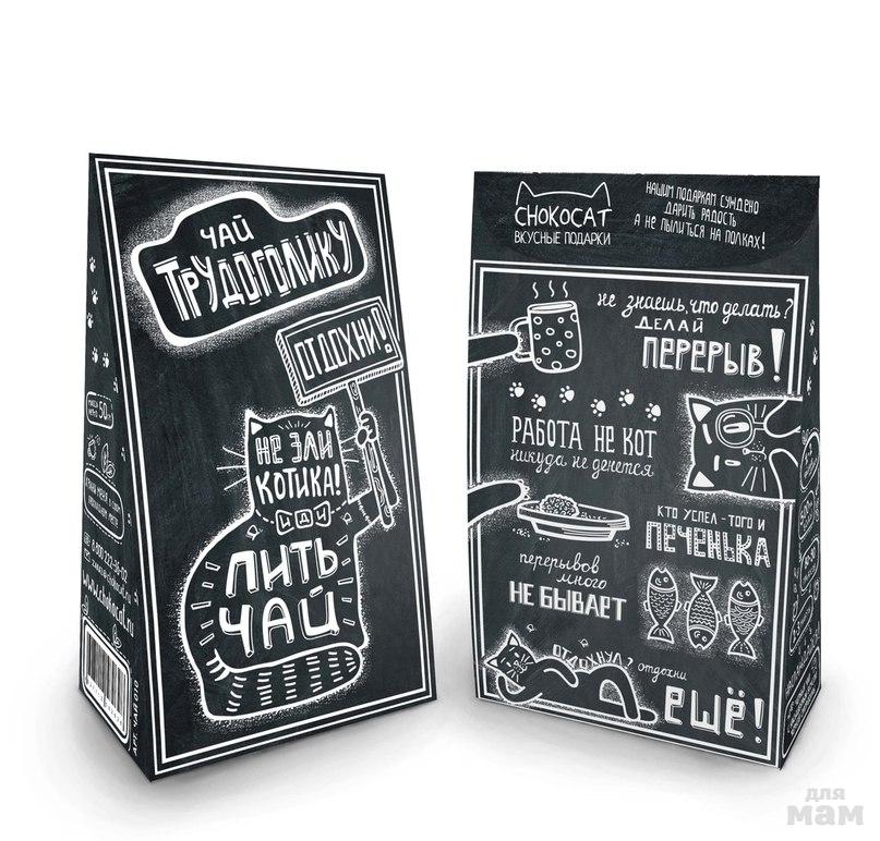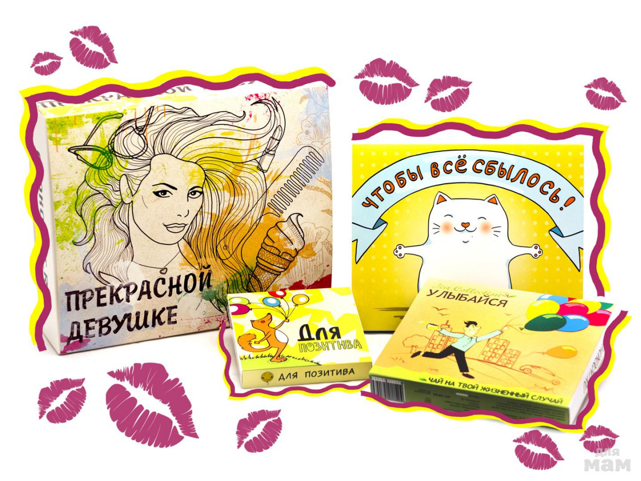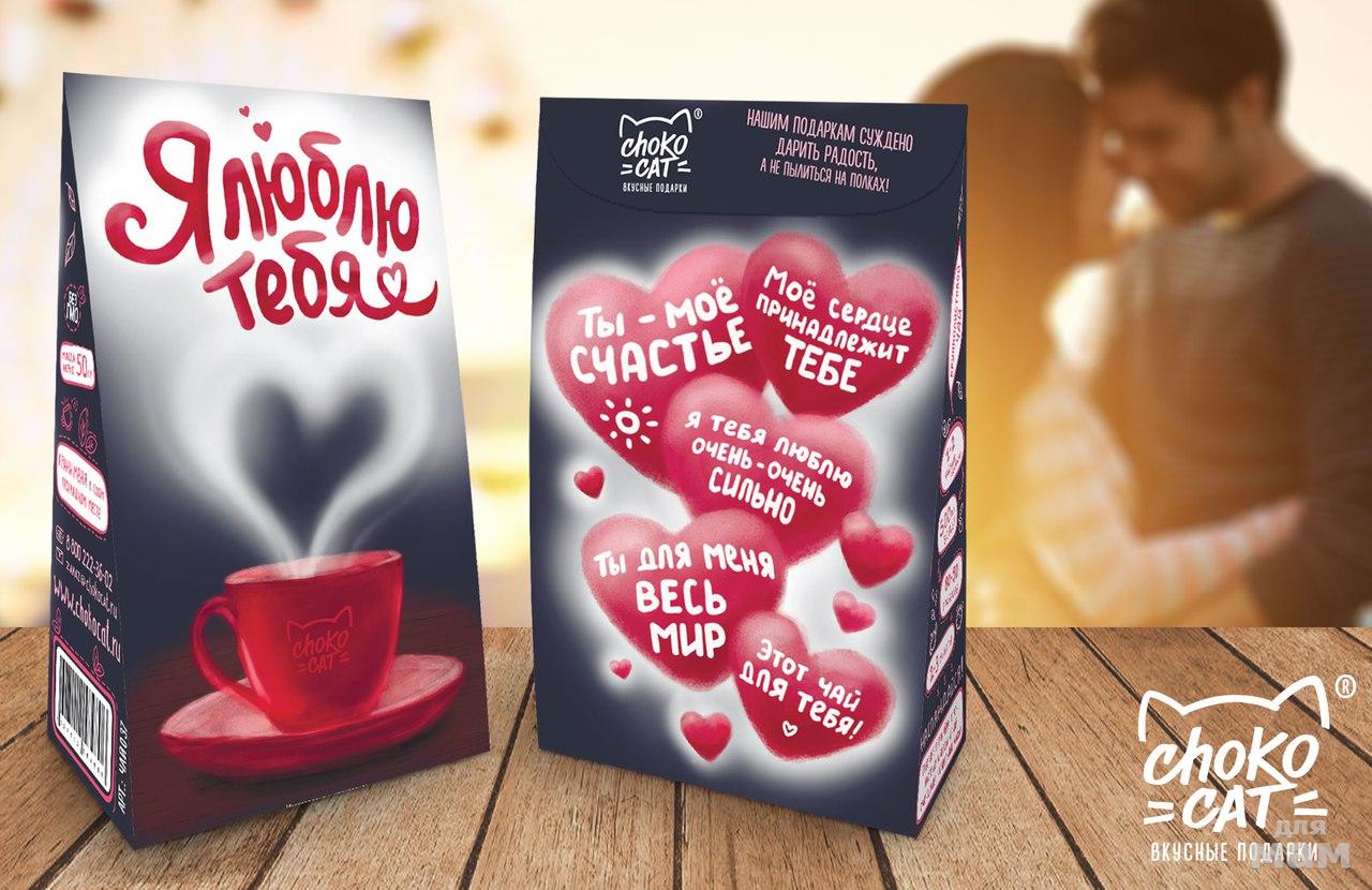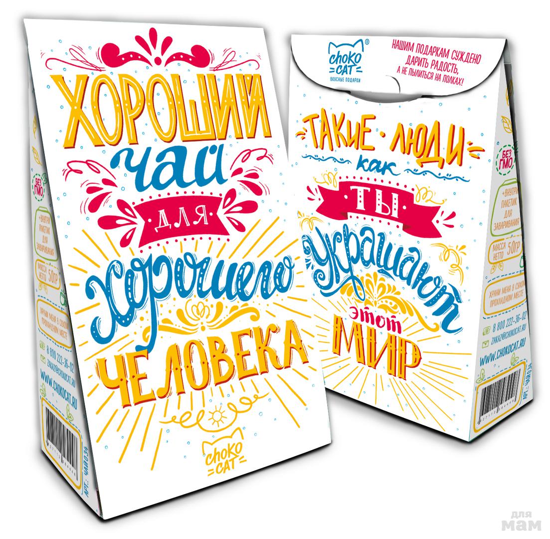 Чай в удобной, дизайнерской упаковке. На обратной стороне тематические пожелания. Внутри отборные сорта крупнолистового черного или зеленого чая с натуральными добавками.