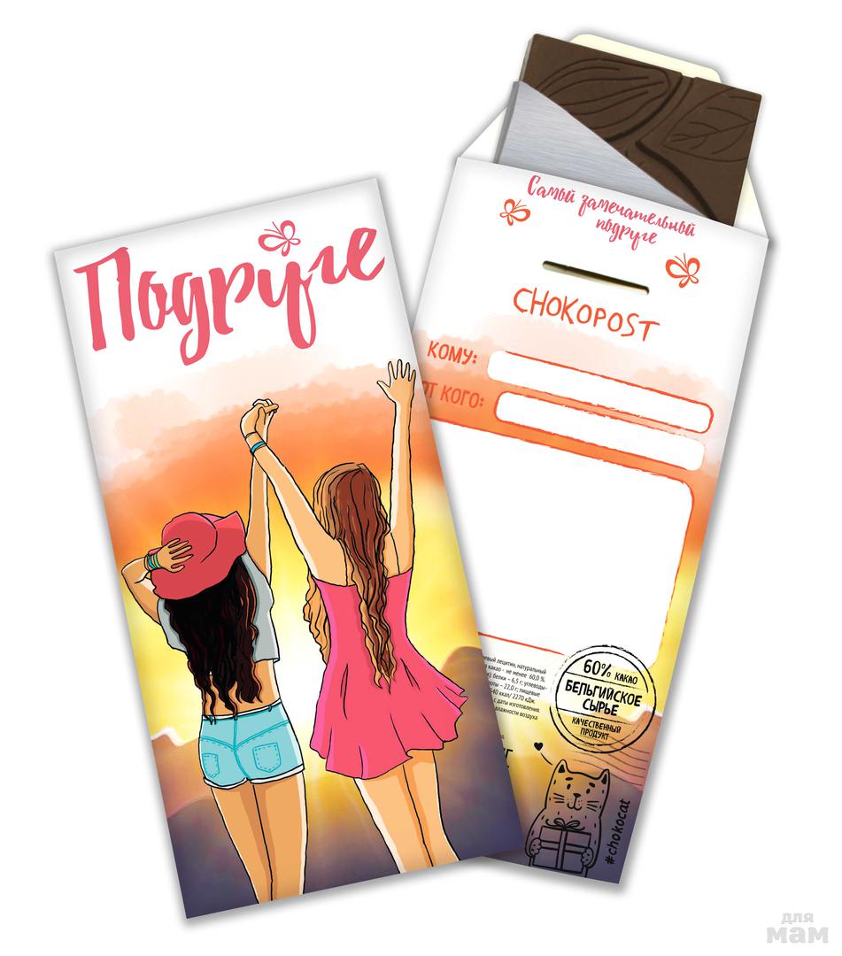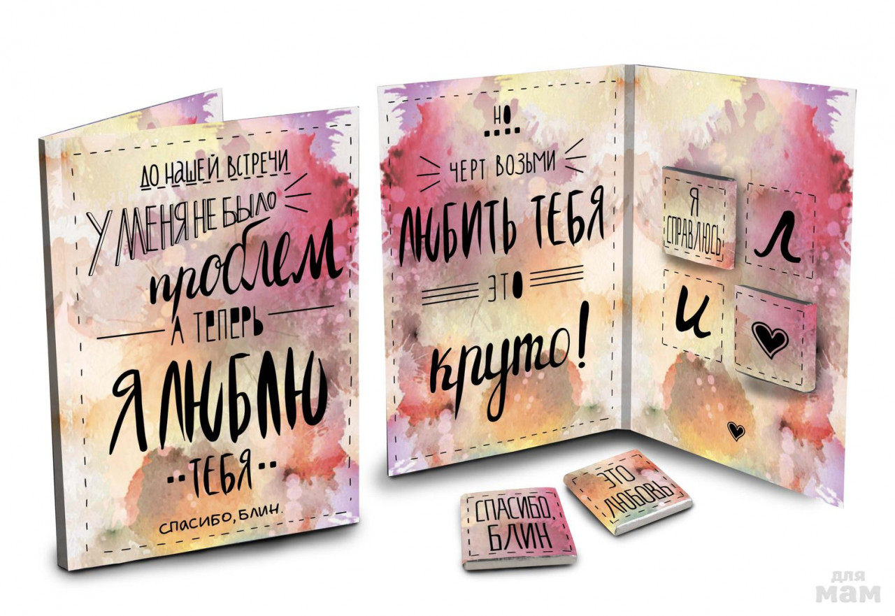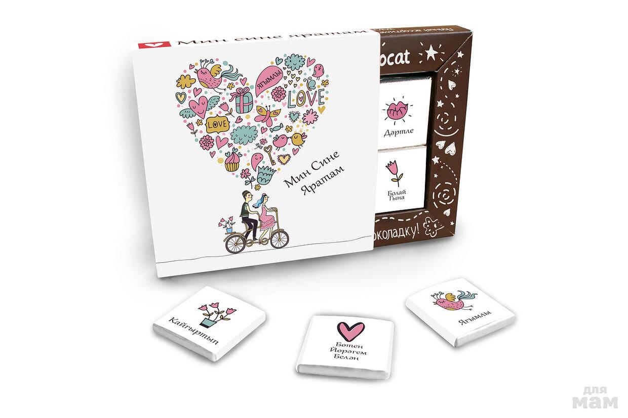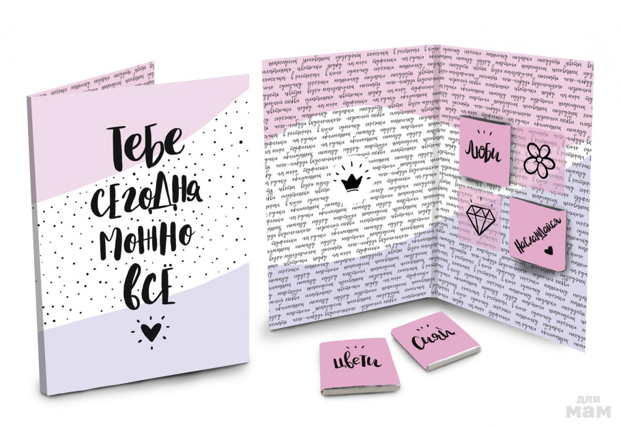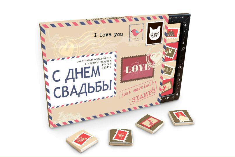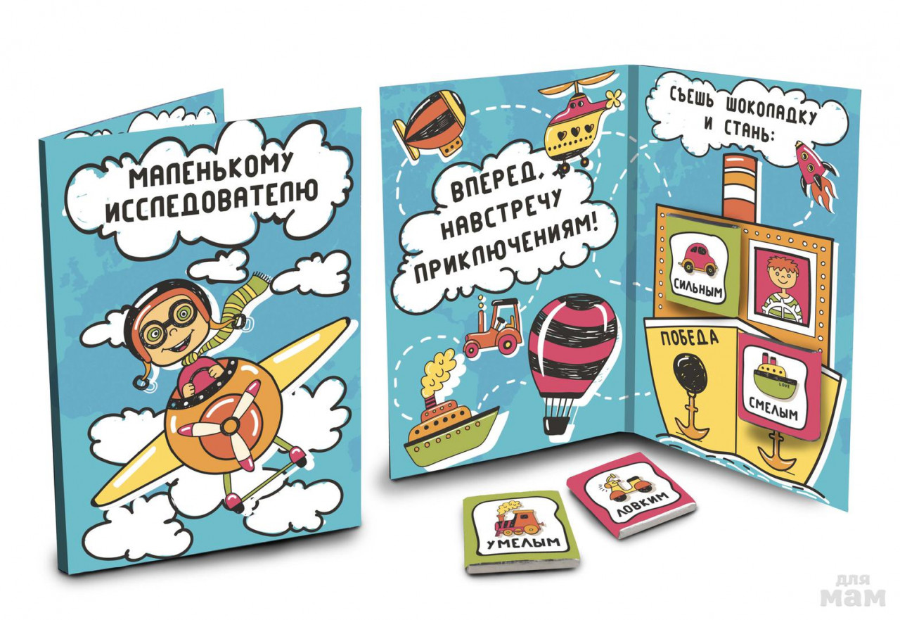 Яркие и современные открытки, внутри которых 4 молочных шоколадки по 5 грамм. Каждая обернута в этикетку с оригинальной иллюстрацией. 19 видов. Молочный шоколад, 36,8% какао. Размер: 21 х 14,8 см. Вес: 20 г. Срок годности: 18 месяцев. Состав: Какао тертое, какао-масло, сахар, молоко сухое, эмульгатор лецитин Е322, ароматизатор "Ванилин" идентичный натуральному.