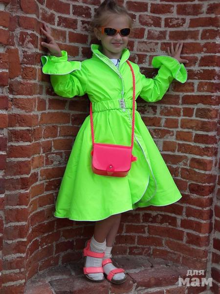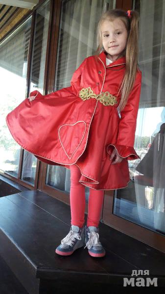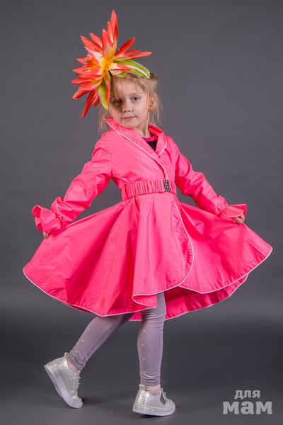 Стильный весенне-летний плащ для юной модницы. Прилегающий силуэт с юбкой солнце-клёш. Имеет красивую окантовку по подолу и воротнику, украшен стразами на воротнике. Для прилегания используется красивый пояс с пряжкой, на широкой резинке. Застежка на кнопках спереди. ЦВЕТОК в комплект не входит!
